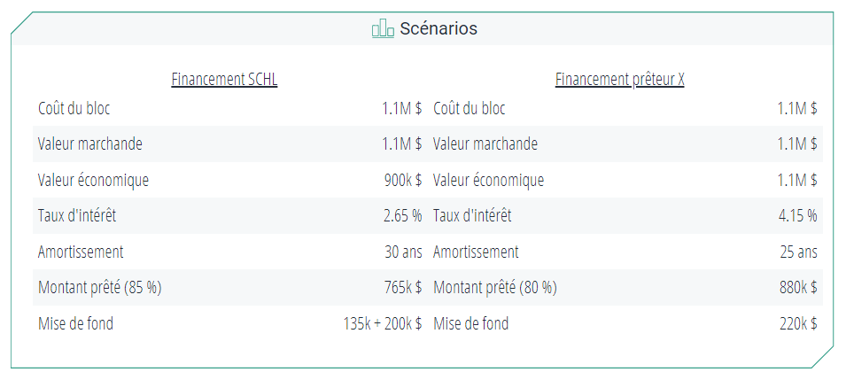 Par contre, une dette plus grande (par exemple, 1.5 % de plus qu'un prêt assuré SCHL) avec un amortissement et une quotité de financement plus petits auraient permis :