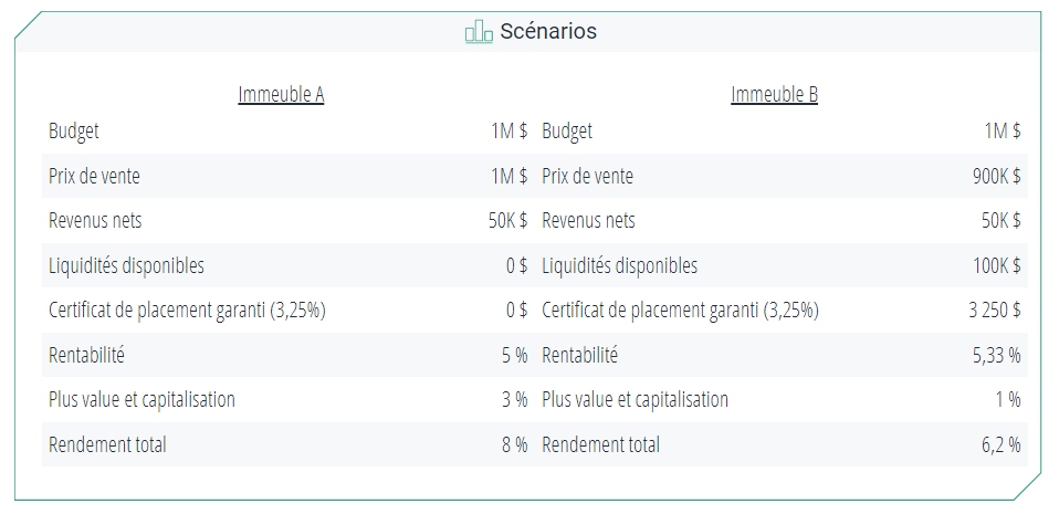 Dans le but d’illustrer ces 2 concepts, disons que nous devons choisir entre 2 immeubles qui rapportent chacun 50K$ de revenus nets par année.