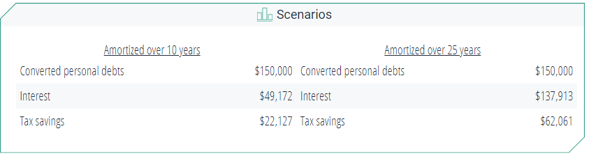 For example, let’s take a look at a $150,000 mortgage loan amortized over 25 years, with a 6% interest rate and a 45% tax rate. Once this debt is converted into a business debt, thanks to cash damming, you would save a total of $62,061 in taxes.