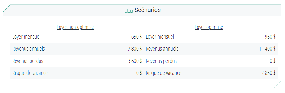 Je vous vois froncer les sourcils. Vous vous dites qu’il vaut mieux avoir un locataire qui paie plutôt qu’un loyer vide. D’accord, jouons ce jeu! Disons que dans le cas de Vincent, notre investisseur fictif, son locataire paie un loyer de 650 $ alors que la moyenne du marché se situe à 950 $. Il s’agit d’une différence d’environ 30 %. Annuellement, ce montant représente 3 600 $ de cash flow perdu.