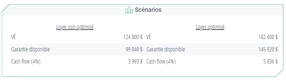 C’est-à-dire que, selon l'exemple de Vincent, une perte de liquidité de 3 600 $ pour ce logement représente, théoriquement, une perte allant de 57 600 $ à 63 000 $ de valeur. De plus, Vincent pourrait utiliser environ 80 % de ce montant en garantie ou en mise de fonds pour acquérir un deuxième immeuble. Il s’agit donc d’une perte de 46 000 $ pour générer du rendement.